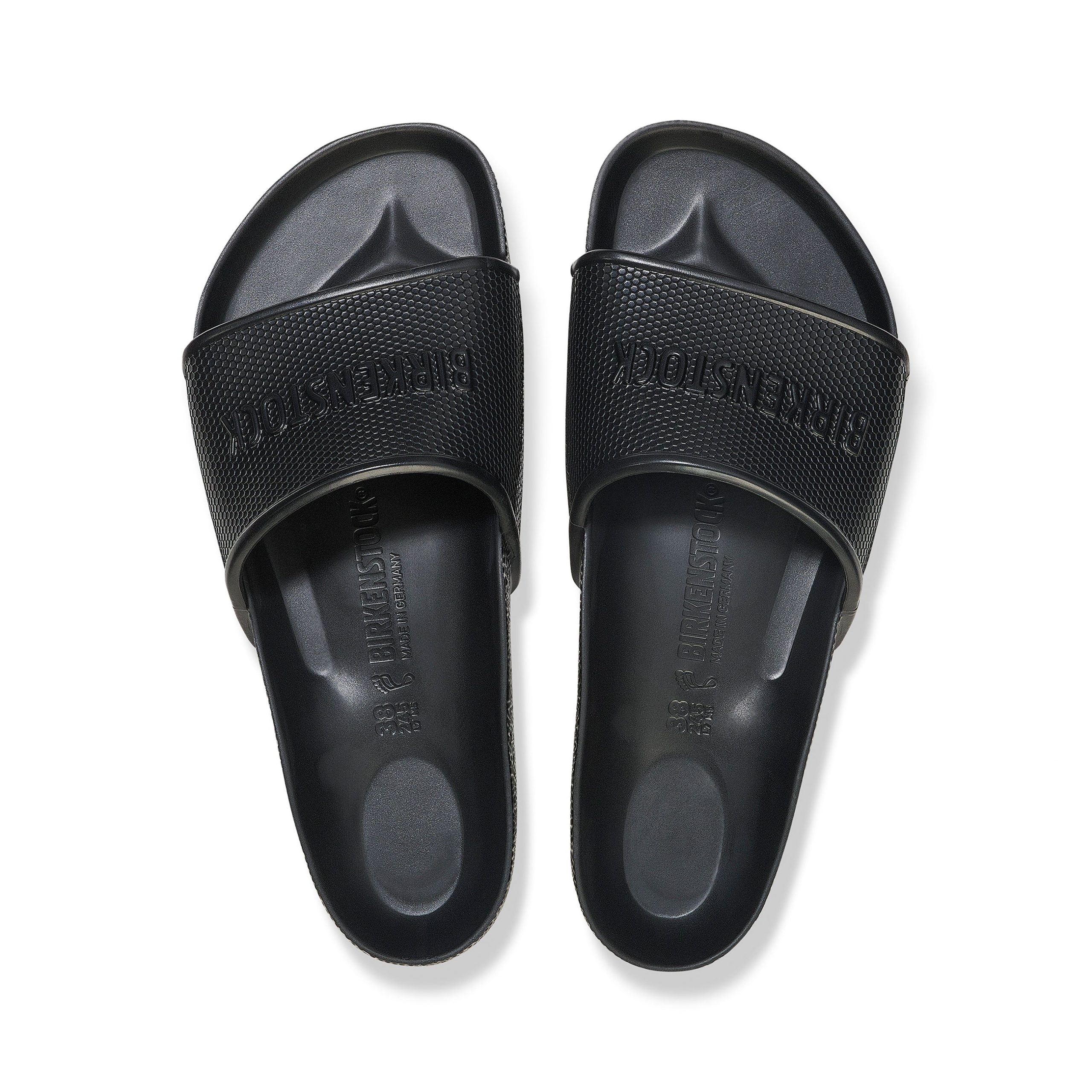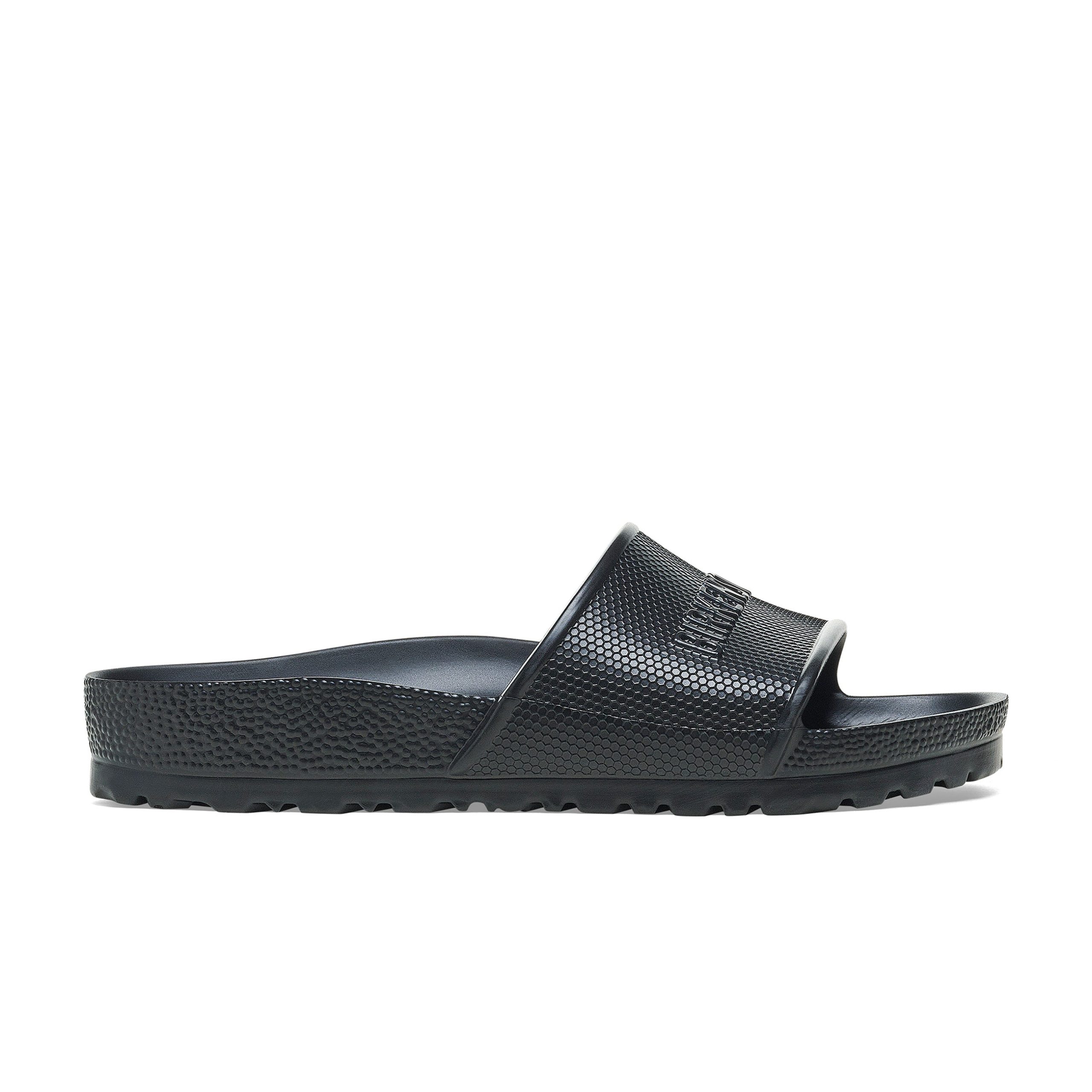The Birkenstock Barbados is a waterproof lightweight. sporty slide design with a hexagon pattern and logo lettering. Modelled on the cork sandal. this sandal is made from one piece of light. flexible and waterproof moulded EVA.