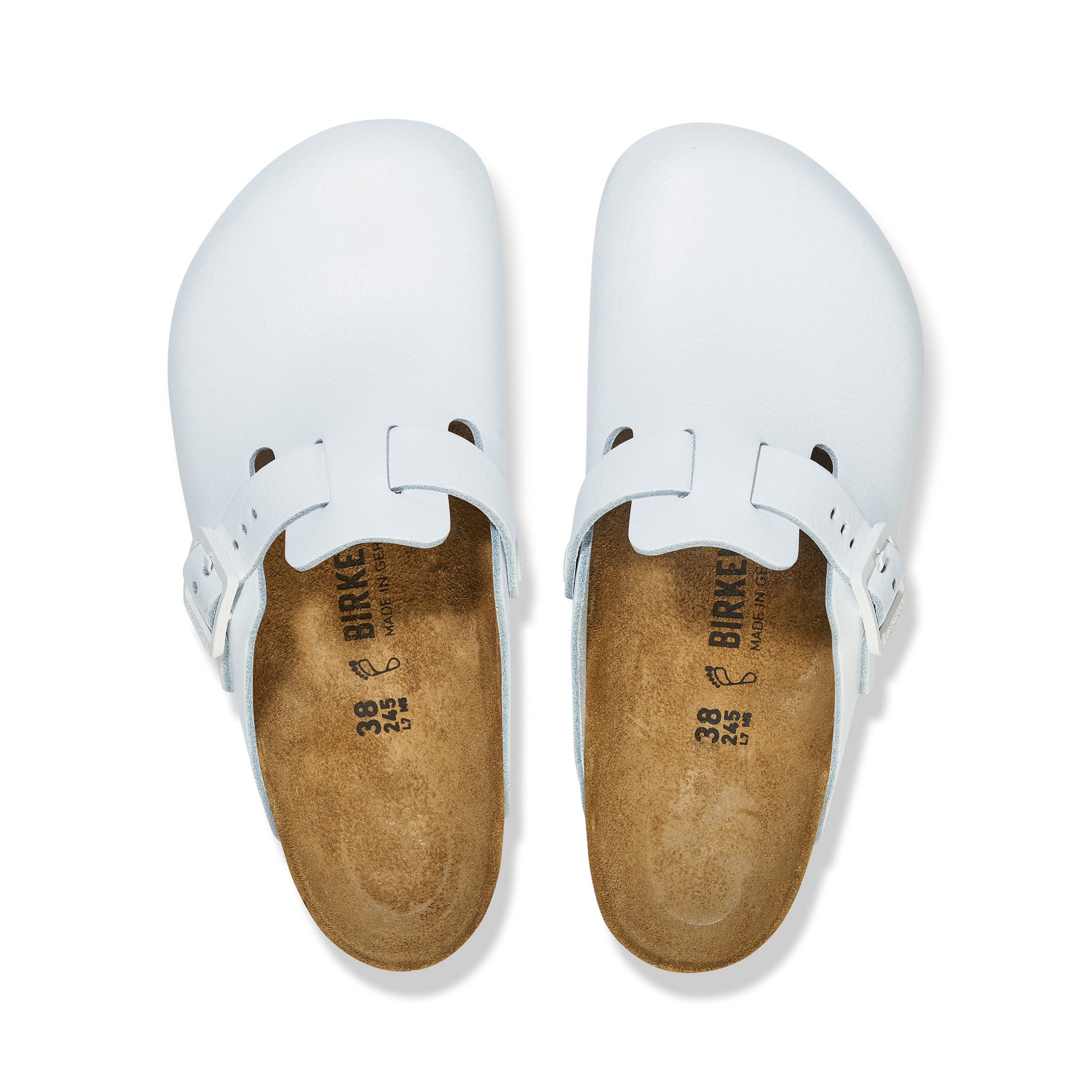 Our best-selling clog. retooled to help you get the job done. The Boston Pro brings on-your-feet functionality from top to bottom a fluid-resistant. PU-coated leather upper. durable. slip-resistant TPU outsole and pronounced tread recreates the style with safety in mind. Featuring legendary Birkenstock design elements. like a contoured cork-latex footbed that supports you through long hours on your feet.