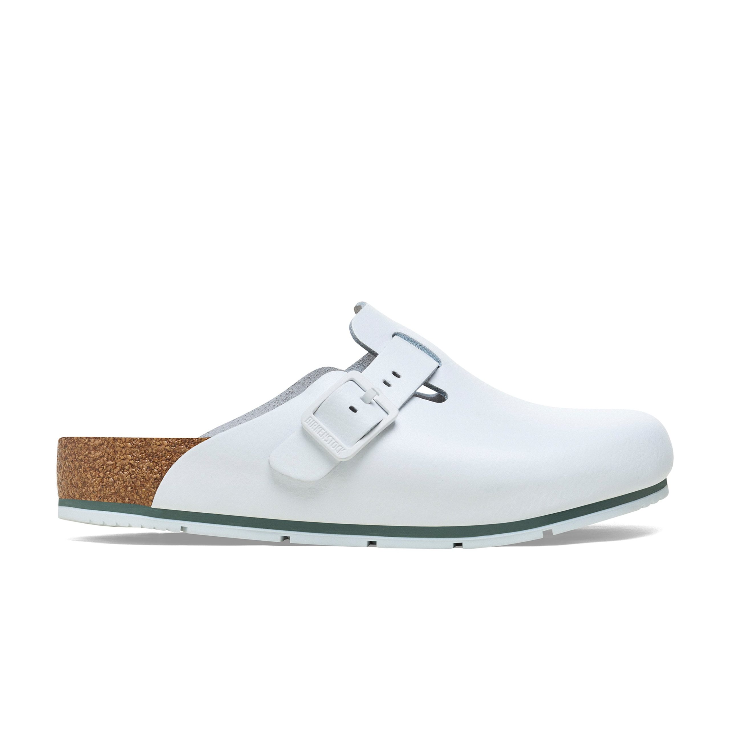 Our best-selling clog. retooled to help you get the job done. The Boston Pro brings on-your-feet functionality from top to bottom a fluid-resistant. PU-coated leather upper. durable. slip-resistant TPU outsole and pronounced tread recreates the style with safety in mind. Featuring legendary Birkenstock design elements. like a contoured cork-latex footbed that supports you through long hours on your feet.